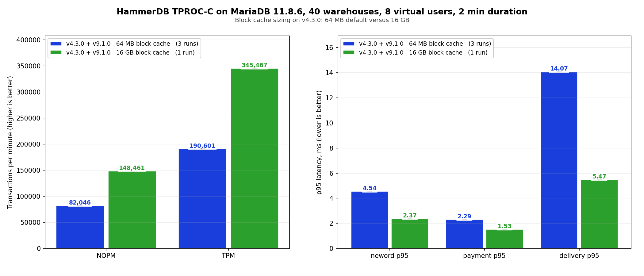 Bumping the block cache to 16 GB on v4.3.0 raises throughput from 190,601 to 345,467 TPM (1.81x) and cuts delivery p95 from 14.07 ms to 5.47 ms. That is cache sizing rather than version difference, but worth showing. If you have the resources these few configs are worth tuning,