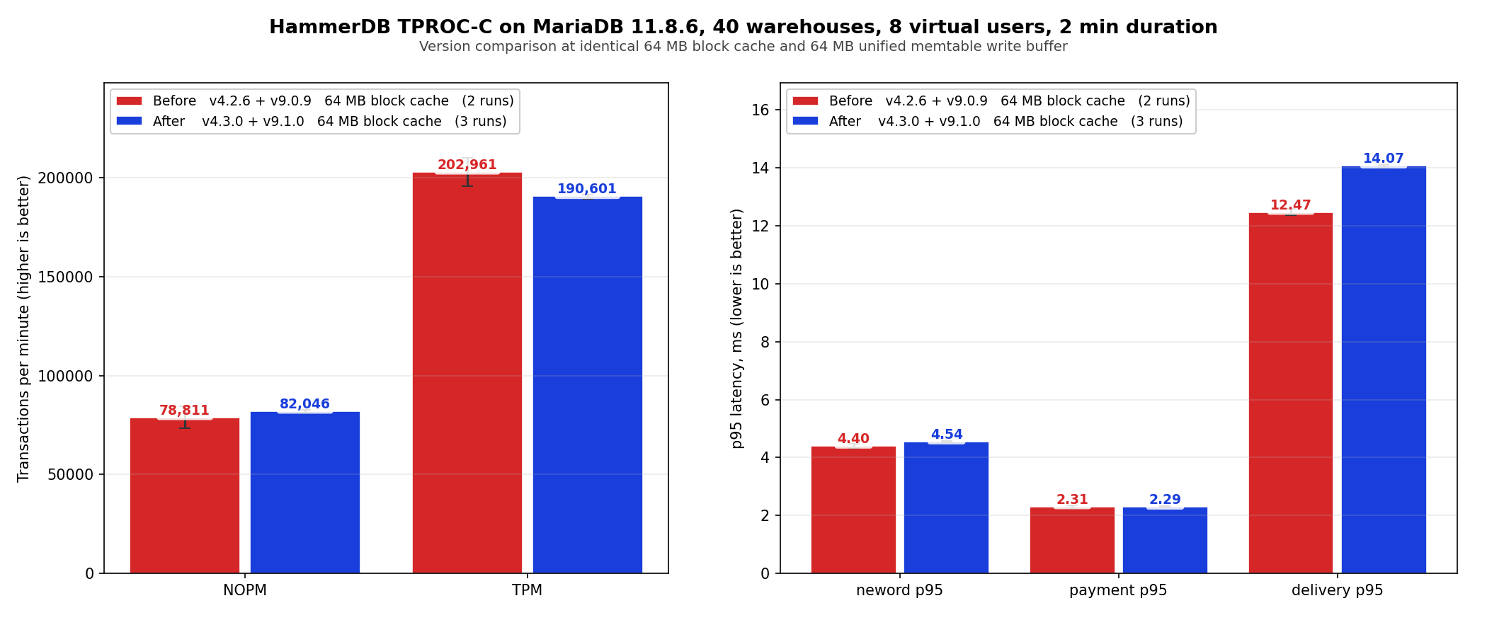 On TPROC-C at 40 warehouses and 8 virtual users, v4.3.0 averages 190,601 TPM and 82,046 NOPM versus v4.2.6’s 202,961 TPM and 78,811 NOPM, both at 64 MB block cache. The TPM delta is minus 6 percent and the NOPM delta is plus 4 percent, and v4.2.6’s own two run spread is wider (196 k to 210 k TPM, 73 k to 84 k NOPM) so the version difference falls inside the run to run variance of the baseline. The delete and batch work does not regress the general OLTP mix.