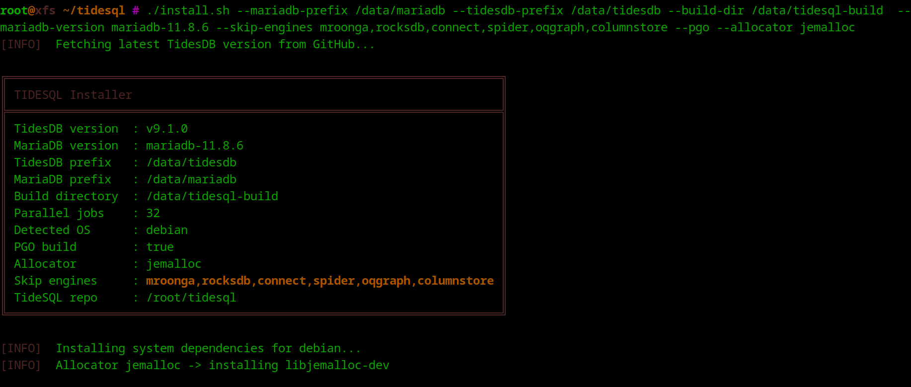./install.sh --mariadb-prefix /data/mariadb --tidesdb-prefix /data/tidesdb --build-dir /data/tidesql-build --mariadb-version mariadb-11.8.6 --skip-engines mroonga,rocksdb,connect,spider,oqgraph,columnstore --pgo --allocator jemalloc