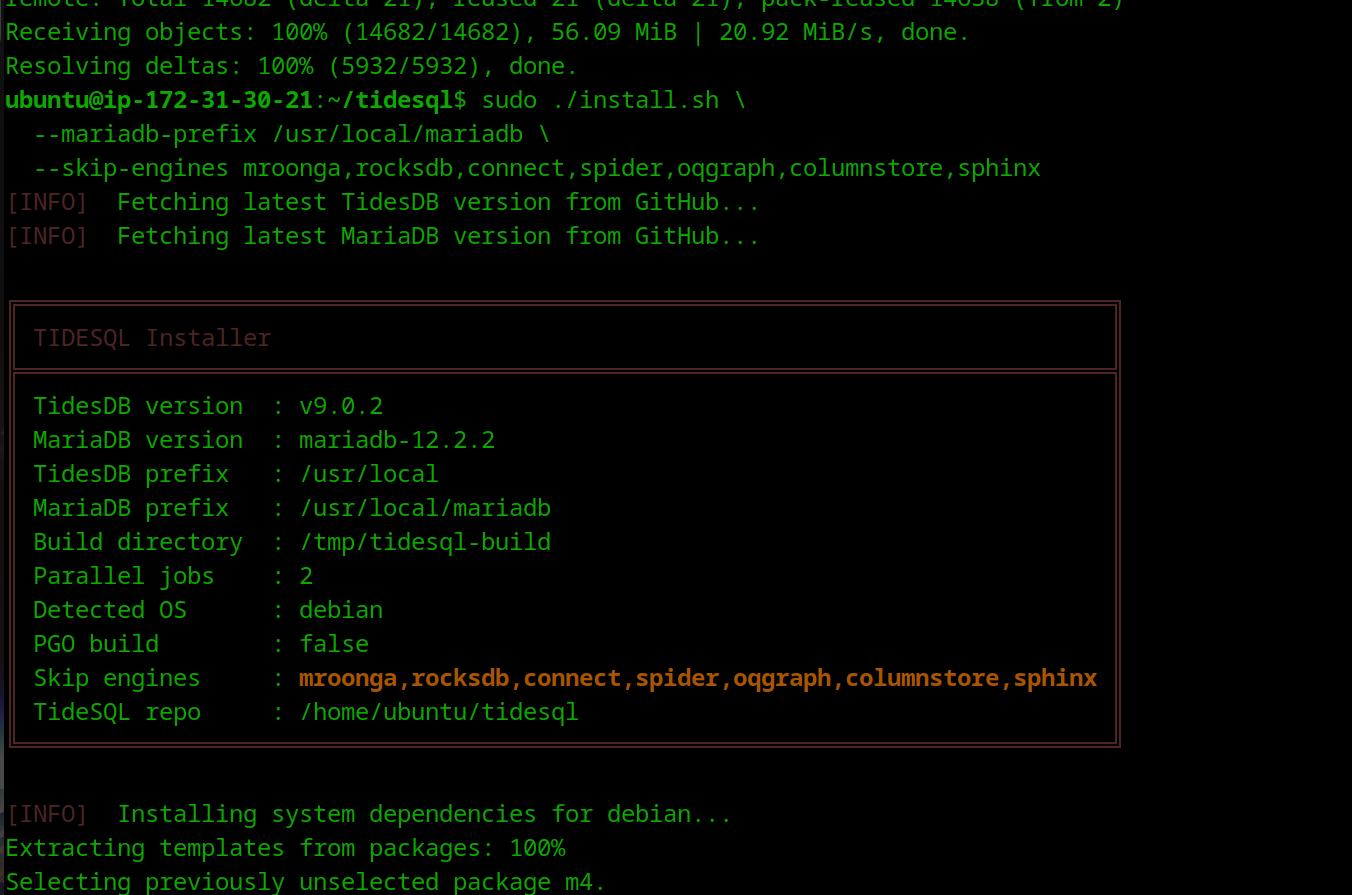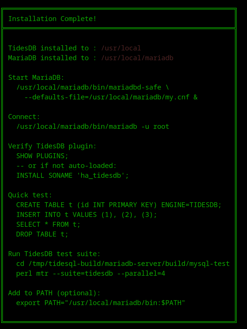 git clone https://github.com/tidesdb/tidesql.gitcd tidesqlRun the installer. This handles all dependencies (cmake, compilers, zstd, lz4, snappy, ssl, etc.), builds TidesDB from source, clones and builds MariaDB with the plugin, initializes the data directory, and writes a production my.cnf.